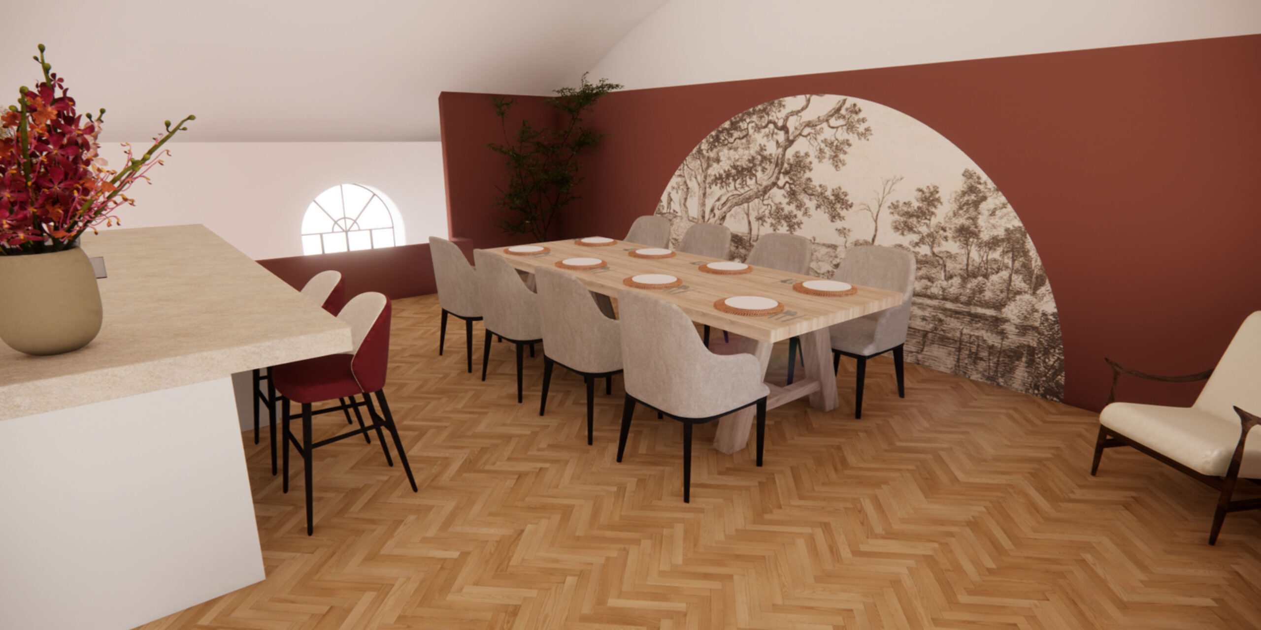 Voor het project Monumentaal Pand mocht ik een kerk ombouwen tot woning. Ik heb alleen de bovenverdieping uitgewerkt, omdat hier de stijl het beste zichtbaar is en een kenmerkend element van de kerk, glas-in-lood, goed tot zijn recht komt. De opdrachtgevers wilde een eclectische stijl met voldoende rust in het interieur.