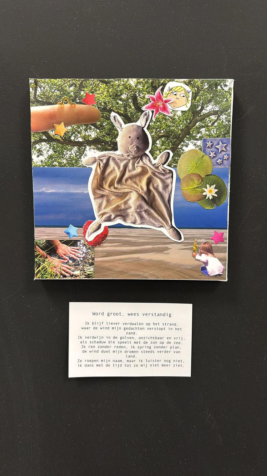 Dit schilderij is een zelfportret. Het geeft weer wat ik belangrijk vindt en wat mij gevormd heeft als persoon. Het zal vast niet door iedereen begrepen worden maar zo hoort het ook. Maar wat mensen wel kunnen is er iet bij voelen en zich er in herkennen. En dat is precies wat ik met dit schilderij wilde weergeven.