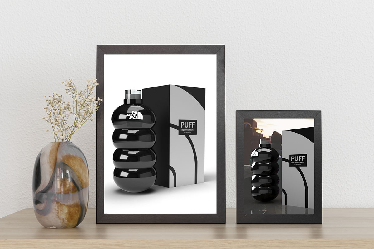 Dit is een conceptontwerp voor een parfumflesje en verpakking, geïnspireerd door de kenmerkende, iconische puffer jas van The North Face. Het ontwerp vertaalt de herkenbare vormen van de jas naar een strak en eenvoudig flesje met bijpassende verpakking, met focus op vormgeving en visuele samenhang.