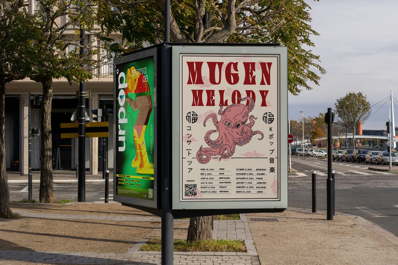 Voor een schoolopdracht heb ik een fictieve band bedacht met de naam Mugen Melody. Het idee was om niet alleen een bandnaam te verzinnen, maar ook een bijpassende visuele stijl te ontwikkelen.