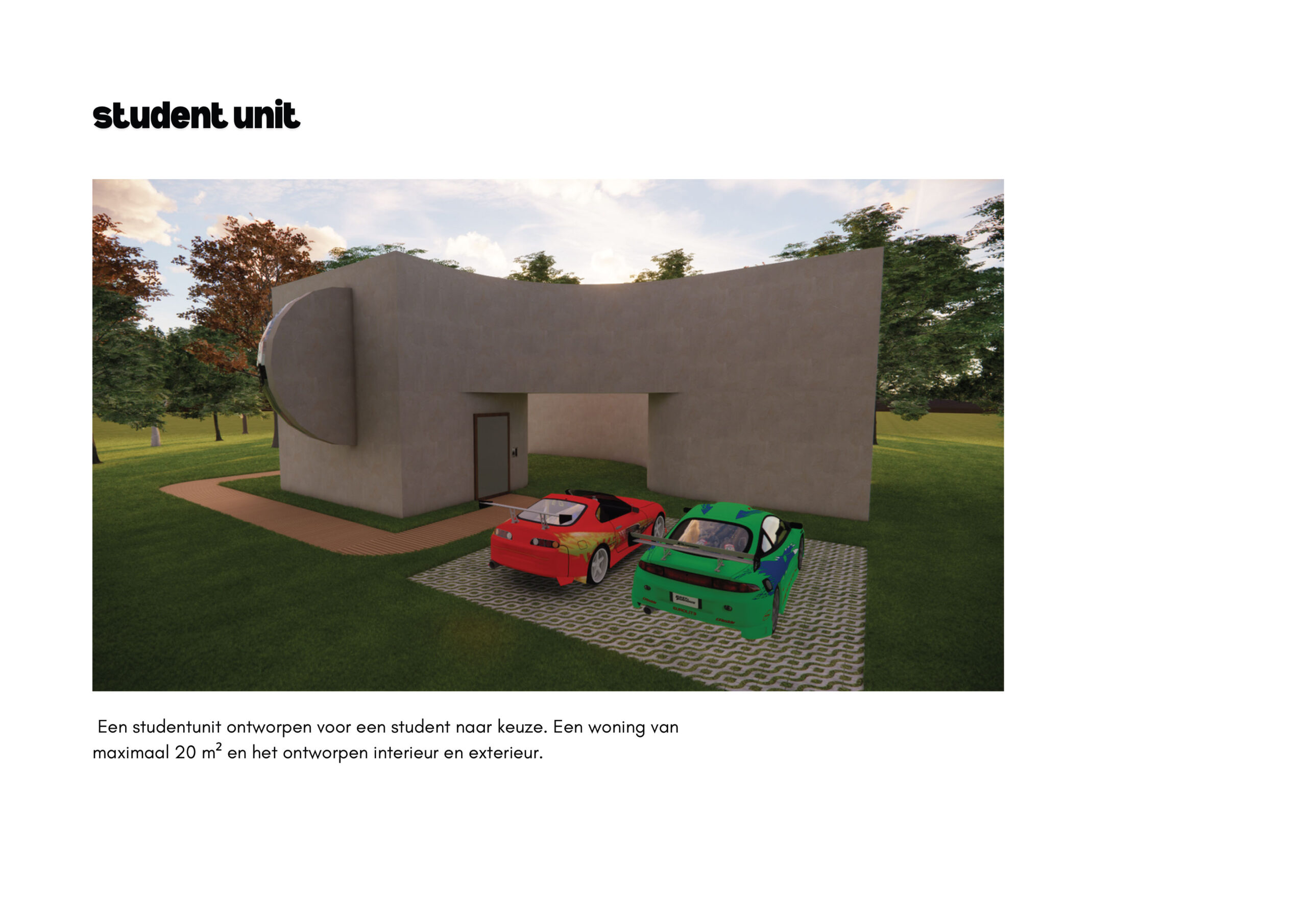 Een studentunit ontworpen voor een student naar keuze. Een woning van maximaal 20 m² en het ontworpen interieur en exterieur