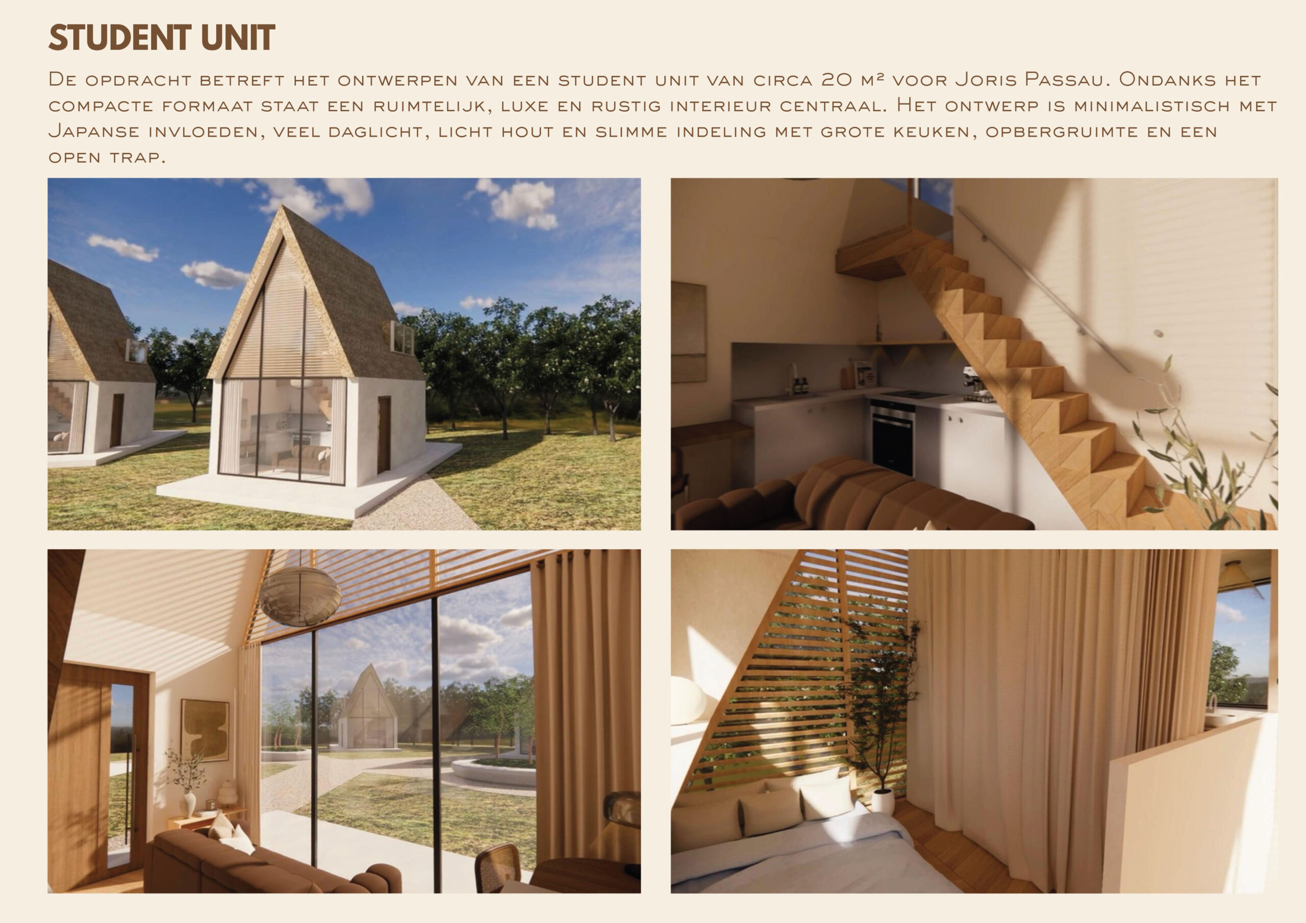 De opdracht betreft het ontwerpen van een student unit van circa 20 m² voor Joris Passau. Ondanks het compacte formaat staat een ruimtelijk, luxe en rustig interieur centraal. Het ontwerp is minimalistisch met Japanse invloeden, veel daglicht, licht hout en slimme indeling met grote keuken, opbergruimte en een open trap