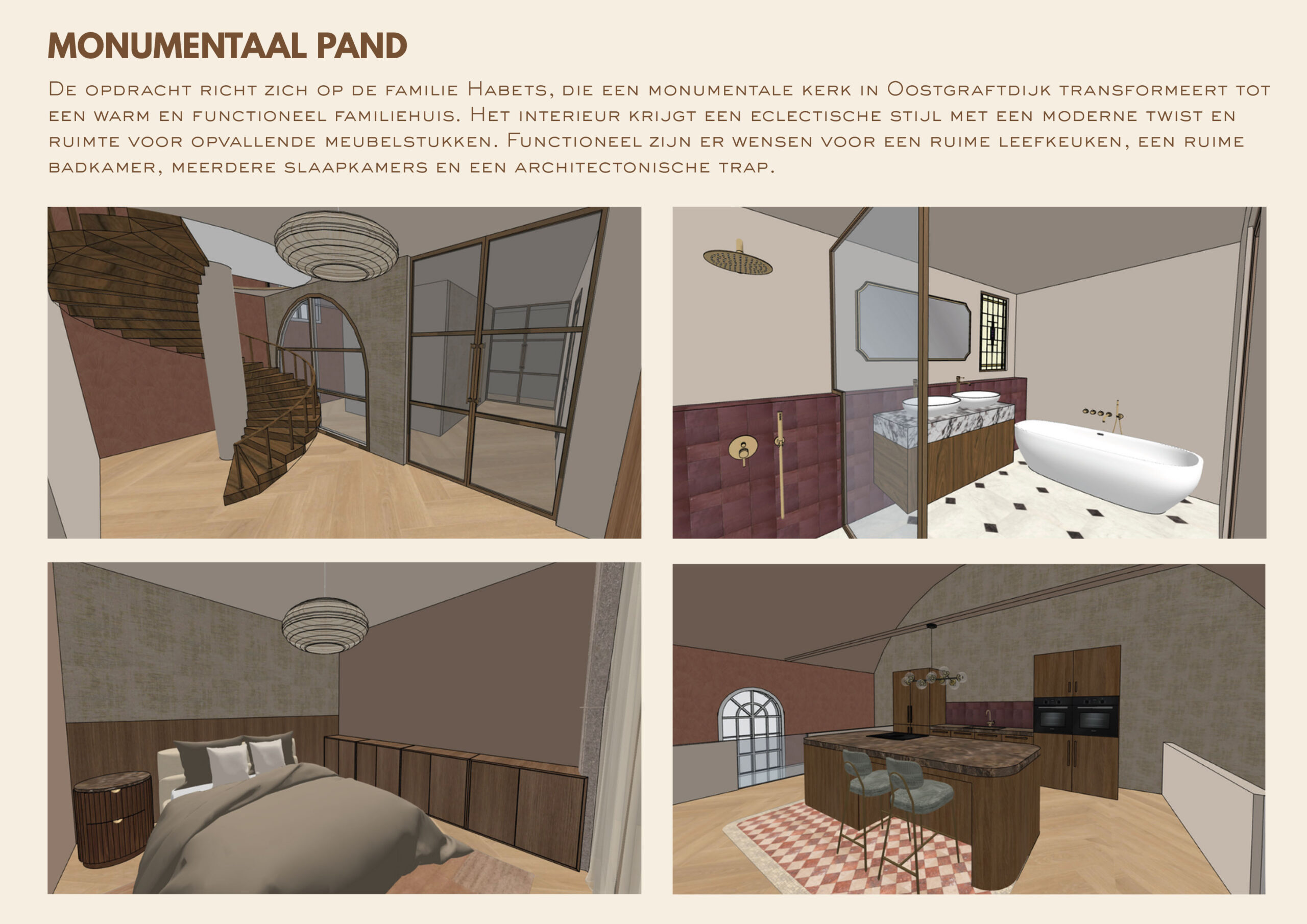De opdracht richt zich op de familie Habets, die een monumentale kerk in Oostgraftdijk transformeert tot een warm en functioneel familiehuis. Het interieur krijgt een eclectische stijl met een moderne twist en ruimte voor opvallende meubelstukken. Functioneel zijn er wensen voor een ruime leefkeuken, een ruime badkamer, meerdere slaapkamers en een architectonische trap