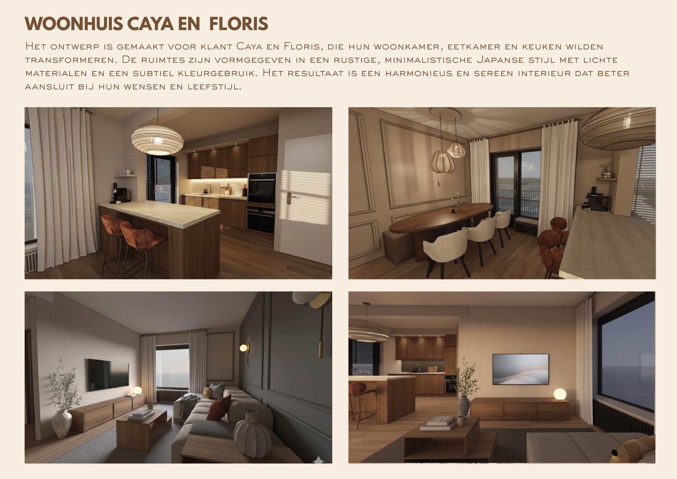 Het ontwerp is gemaakt voor klant Caya en Floris, die hun woonkamer, eetkamer en keuken wilden transformeren. De ruimtes zijn vormgegeven in een rustige, minimalistische Japanse stijl met lichte materialen en een subtiel kleurgebruik. Het resultaat is een harmonieus en sereen interieur dat beter aansluit bij hun wensen en leefstijl